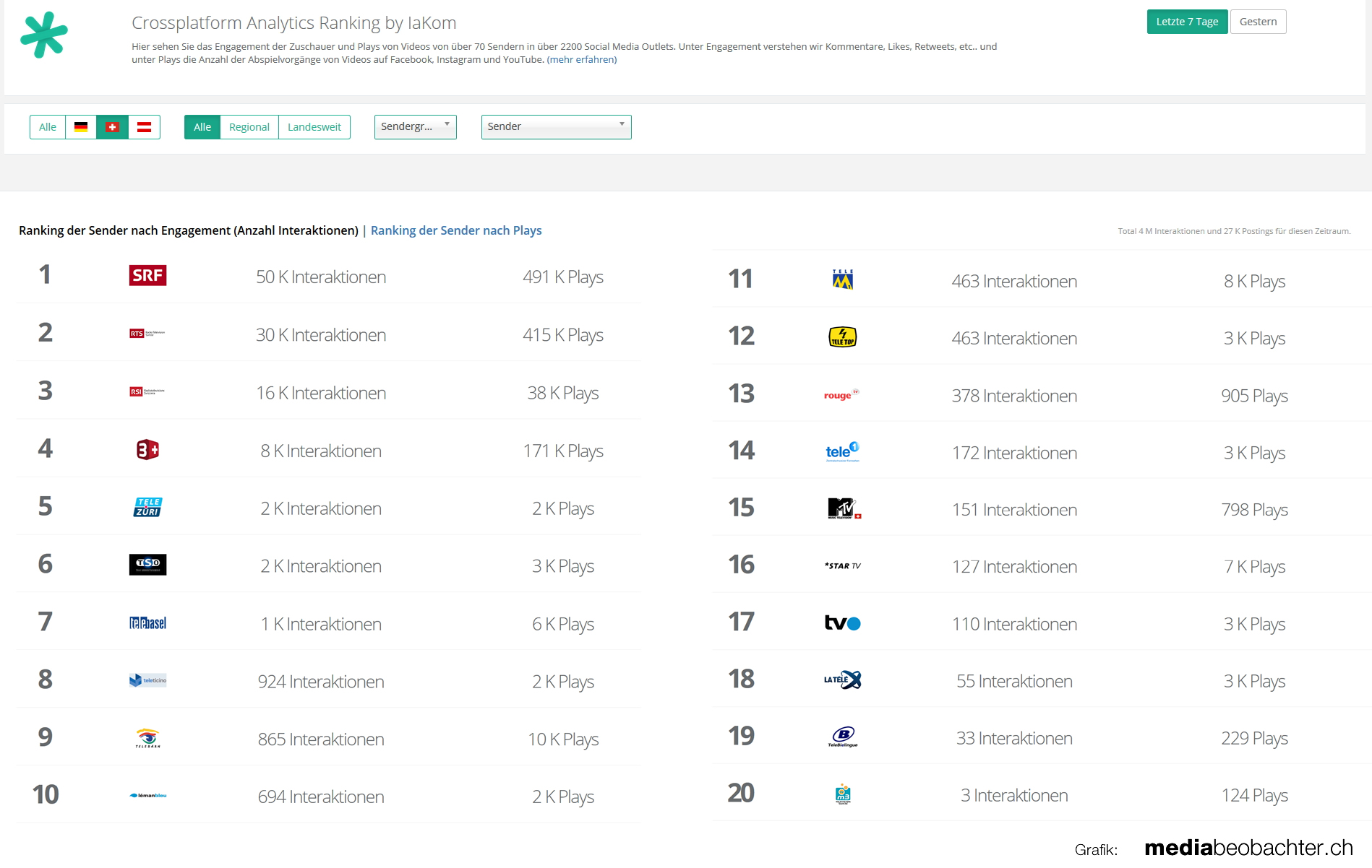 Für TV Stationen bietet das Internet strategische Möglichkeiten im Reichweiten-Wettbewerb. Wie wichtig Online und Socialmedia inzwischen sind, lassen die Investitionen erahnen: die SRG gibt gemäss Bundesrat jährlich 56 Mio dafür aus. Mit dem kostenlosen Social Media Ranking Tool der IaKom ist es möglich die Social Media Interaktionen und Abspielvorgänge (Plays) von über 70 TV Sender im DACH Raum zu vergleichen.