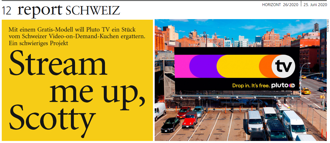 Mit PlutoTV sucht ein weiterer Herausforderer sein Glück im Streaming-Markt-Schweiz. Horizont Report Schweiz analysiert den Markt und die Chancen. Konnte mit Ralf Beyeler (Moneyland) und Alex Beerli von Goldbach Audience Inputs geben: