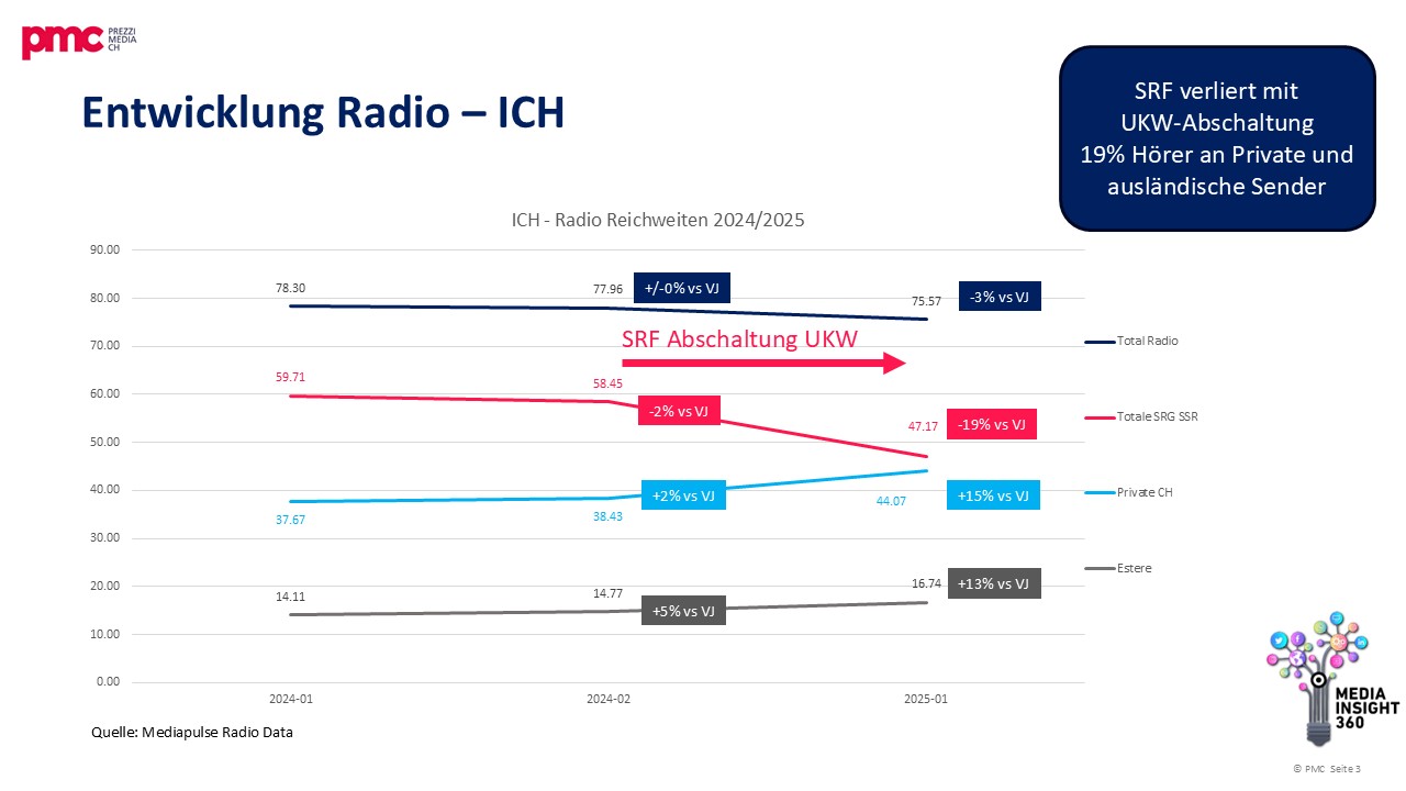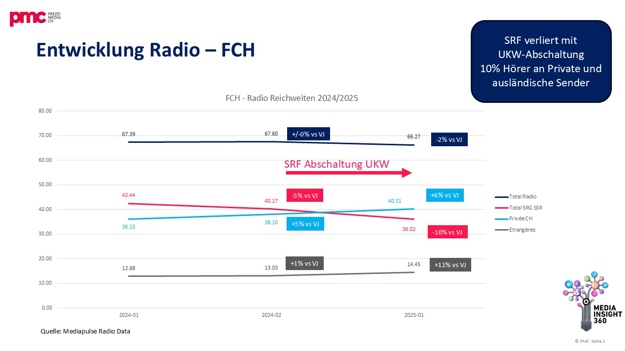 Wie die Mediapulse Messungen zeigen, sind die Hörerzahlen insgesamt stabil. Es hat eine Verschiebung von SRG zu Privatradios und ausländischen Sendern, welche alle noch auf UKW empfangbar sind, stattgefunden. Der Grund dafür ist klar technischer Natur und nicht das Programm der SRG Sender. Wenn UKW wegfällt, schalten die Hörer auf andere Sender um. Falls es aber gänzlich ruhig wird auf UKW, orientieren sich die Hörer ganz neu.